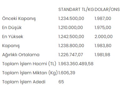 Borsa İstanbul Kıymetli Madenler ve Kıymetli Taşlar Piyasası'nda (KMKTP), altında gerçekleşen toplam işlem hacmi 1 milyar 963 milyon 360 bin 489,58 lira, işlem miktarı ise 1.606,39 kilogram oldu.