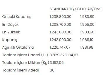 Altın piyasasında, en düşük 1 milyon 208 bin 700 lira, en yüksek 1 milyon 243 bin lirayı gören standart altının kilogram fiyatı, günü önceki kapanışa göre yüzde 0,34 artışla 1 milyon 243 bin liradan tamamladı.