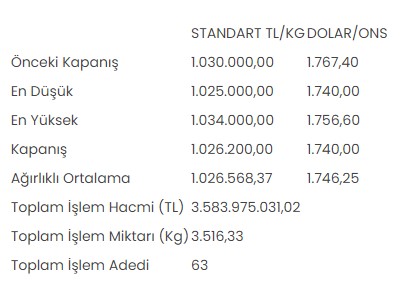 KMKTP'de, altında gerçekleşen toplam işlem hacmi 3 milyar 583 milyon 975 bin 31,02 lira, işlem miktarı ise 3.516,33 kilogram oldu.