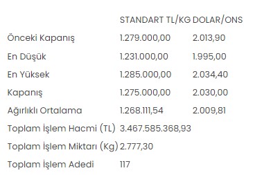 Altın piyasasında, en düşük 1 milyon 231 bin lira, en yüksek 1 milyon 285 bin lirayı gören standart altının kilogram fiyatı, günü önceki kapanışa göre yüzde 0,3 azalışla 1 milyon 275 bin liradan tamamladı.