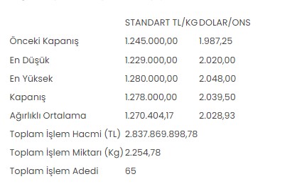 Altın piyasasında, en düşük 1 milyon 229 bin lira, en yüksek 1 milyon 280 bin lirayı gören standart altının kilogram fiyatı, günü önceki kapanışa göre yüzde 2,7 artışla 1 milyon 278 bin liradan tamamladı.