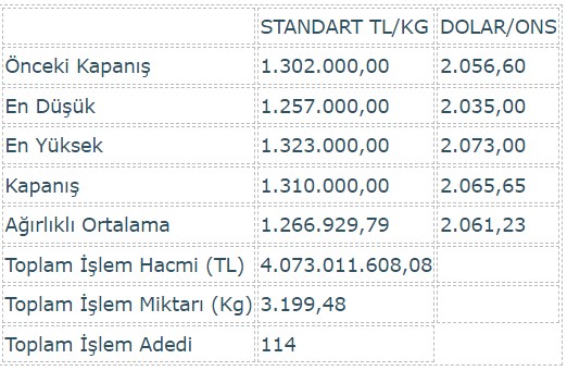 Kıymetli Madenler ve Kıymetli Taşlar Piyasası (KMKTP)'de, altında gerçekleşen toplam işlem hacmi 4 milyar 73 milyon 11 bin 608,08 lira, işlem miktarı ise 3.199,48 kilogram oldu.