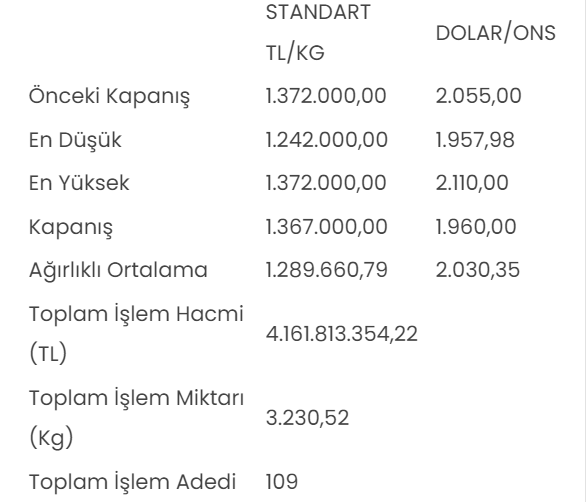 Tüm metallerdeki toplam işlem hacmi de 4 milyar 316 milyon 201 bin 719,63 lira düzeyinde gerçekleşti.