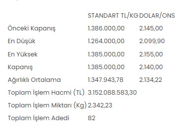 Borsa İstanbul Kıymetli Madenler ve Kıymetli Taşlar Piyasası'nda (KMKTP), altında gerçekleşen toplam işlem hacmi 3 milyar 152 milyon 88 bin 583,30 lira, işlem miktarı ise 2.342,23 kilogram oldu.