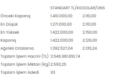 Borsa İstanbul Kıymetli Madenler ve Kıymetli Taşlar Piyasası'nda (KMKTP), en düşük 1 milyon 271 bin lira, en yüksek 1 milyon 422 bin lirayı gören standart altının kilogram fiyatı, günü önceki kapanışa göre yüzde 0,9 artarak 1 milyon 422 bin liradan tamamladı.