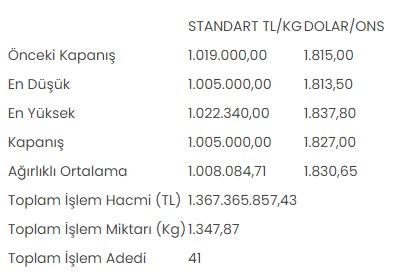 Tüm metallerdeki toplam işlem hacmi de 1 milyar 490 milyon 682 bin 328,27 lira düzeyinde gerçekleşti.