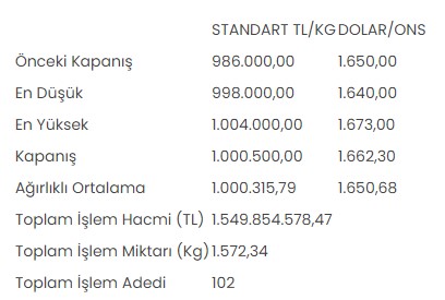 KMKTP'de, altında gerçekleşen toplam işlem hacmi 1 milyar 549 milyon 854 bin 578,47 lira, işlem miktarı ise 1.572,34 kilogram oldu.