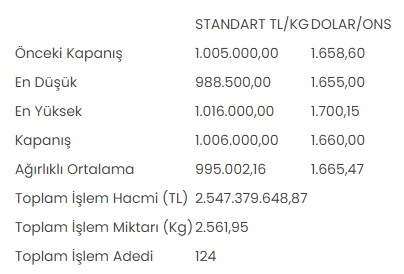 Tüm metallerdeki toplam işlem hacmi de 2 milyar 609 milyon 798 bin 2,42 lira düzeyinde gerçekleşti.