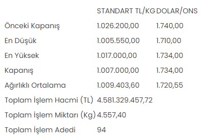 Tüm metallerdeki toplam işlem hacmi de 4 milyar 598 milyon 783 bin 985,72 lira düzeyinde gerçekleşti.