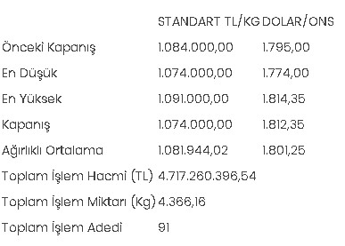 Borsa İstanbul Kıymetli Madenler ve Kıymetli Taşlar Piyasası'nda (KMKTP), altında gerçekleşen toplam işlem hacmi 4 milyar 717 milyon 260 bin 396,54 lira, işlem miktarı ise 4.366,16 kilogram oldu.