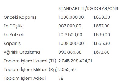 Tüm metallerdeki toplam işlem hacmi de 2 milyar 50 milyon 120 bin 23,79 lira düzeyinde gerçekleşti.