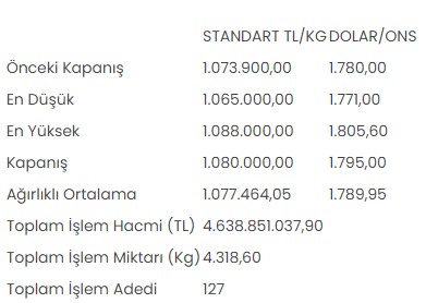 Tüm metallerdeki toplam işlem hacmi de 4 milyar 638 milyon 851 bin 37,90 lira düzeyinde gerçekleşti.