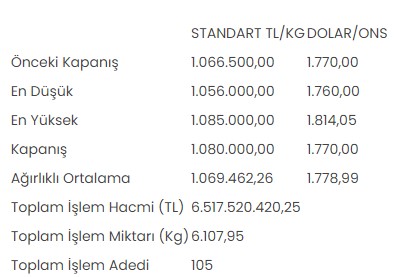 Tüm metallerdeki toplam işlem hacmi de 6 milyar 656 milyon 90 bin 765,52 lira düzeyinde gerçekleşti.