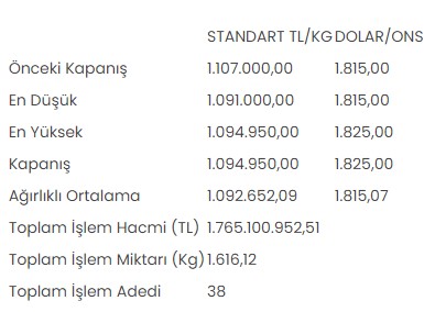 Tüm metallerdeki toplam işlem hacmi de 1 milyar 812 milyon 115 bin 108,45 lira düzeyinde gerçekleşti.