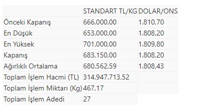 KMKTP'de, altında gerçekleşen toplam işlem hacmi 314 milyon 947 bin 713,52 lira, işlem miktarı ise 467,17 kilogram oldu.