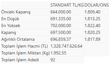 KMKTP'de, altında gerçekleşen toplam işlem hacmi 1 milyar 328 milyon 747 bin 626,64 lira, işlem miktarı ise 1.992,55 kilogram oldu.