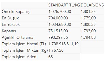 Tüm metallerdeki toplam işlem hacmi ise 1 milyar 722 milyon 8 bin 567,82 lira düzeyinde gerçekleşti.