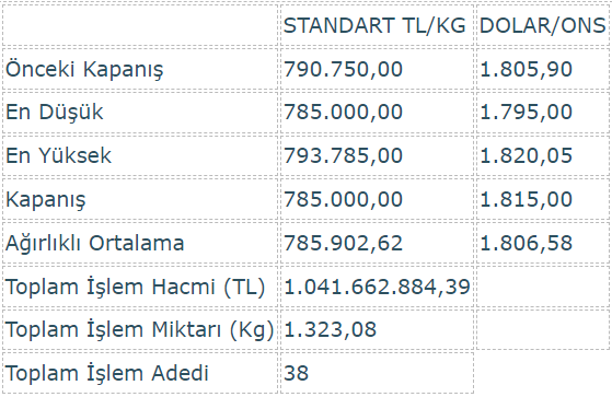 KMKTP'de, altında gerçekleşen toplam işlem hacmi 1 milyar 41 milyon 662 bin 884,39 lira, işlem miktarı ise 1.323,08 kilogram oldu.