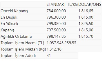 KMKTP'de, altında gerçekleşen toplam işlem hacmi 1 milyar 37 milyon 943 bin 239,53 lira, işlem miktarı ise 1.312,18 kilogram oldu.