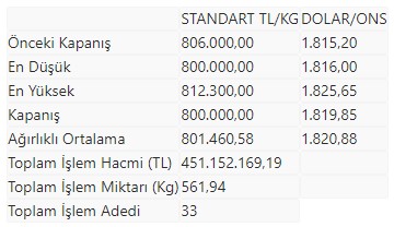 KMKTP'de, altında gerçekleşen toplam işlem hacmi 451 milyon 152 bin 169,19 lira, işlem miktarı ise 561,94 kilogram oldu.