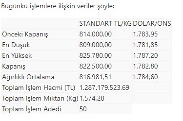 Altın piyasasında, en düşük 809 bin lira, en yüksek ise 825 bin 780 lirayı gören standart altının kilogram fiyatı, günü önceki kapanışa göre yüzde 1,04 artışla 822 bin 500 liradan tamamladı.