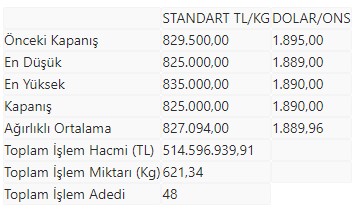 KMKTP'de, altında gerçekleşen toplam işlem hacmi 514 milyon 596 bin 939,91 lira, işlem miktarı ise 621,34 kilogram oldu.
