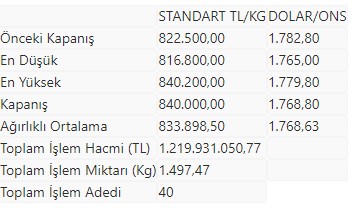 KMKTP'de, altında gerçekleşen toplam işlem hacmi 1 milyar 219 milyon 931 bin 50,77 lira, işlem miktarı ise 1.497,47 kilogram oldu.
