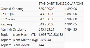 KMKTP'de, altında gerçekleşen toplam işlem hacmi 1 milyar 995 milyon 782 bin 236,52 lira, işlem miktarı ise 2.397,30 kilogram oldu.