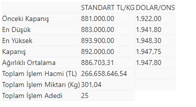 KMKTP'de, altında gerçekleşen toplam işlem hacmi 266 milyon 658 bin 646,54 lira, işlem miktarı ise 301,04 kilogram oldu.