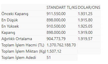 KMKTP'de, altında gerçekleşen toplam işlem hacmi 1 milyar 370 milyon 762 bin 188,70 lira, işlem miktarı ise 1.507,12 kilogram oldu.