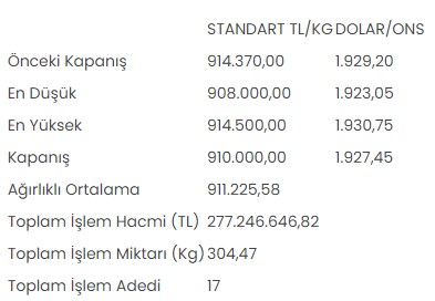 KMKTP'de, altında gerçekleşen toplam işlem hacmi 277 milyon 246 bin 646,82 lira, işlem miktarı ise 304,47 kilogram oldu.