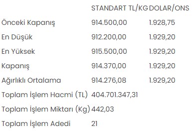 KMKTP'de, altında gerçekleşen toplam işlem hacmi 404 milyon 701 bin 347,31 lira, işlem miktarı ise 442,03 kilogram oldu.
