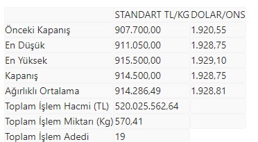 KMKTP'de, altında gerçekleşen toplam işlem hacmi 516 milyon 876 bin 357,50 lira, işlem miktarı ise 570,69 kilogram oldu.