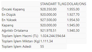 KMKTP'de, altında gerçekleşen toplam işlem hacmi 1 milyar 24 milyon 244 bin 594,64 lira, işlem miktarı ise 1.111,34 kilogram oldu.