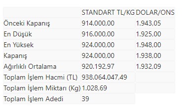 KMKTP'de, altında gerçekleşen toplam işlem hacmi 938 milyon 64 bin 47,49 lira, işlem miktarı ise 1.028,69 kilogram oldu.