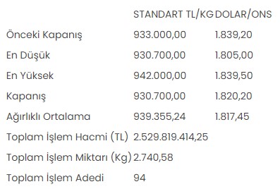 Altın piyasasında, en düşük 930 bin 700 lira, en yüksek 942 bin lirayı gören standart altının kilogram fiyatı, günü önceki kapanışa göre yüzde 0,2 azalarak 930 bin 700 liradan tamamladı.
