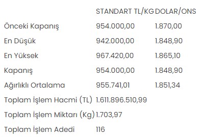 KMKTP'de, altında gerçekleşen toplam işlem hacmi 1 milyar 611 milyon 896 bin 510,99 lira, işlem miktarı ise 1.703,97 kilogram oldu.