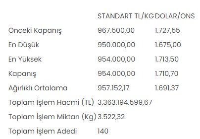 Altın piyasasında, en düşük 950 bin lira, en yüksek 954 bin lirayı gören standart altının kilogram fiyatı, günü önceki kapanışa göre yüzde 1,4 azalarak 954 bin liradan tamamladı.