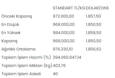 Altın piyasasında, en düşük 968 bin lira, en yüksek 984 bin lirayı gören standart altının kilogram fiyatı, günü önceki kapanışa göre yüzde 0,4 azalarak 968 bin liradan tamamladı.