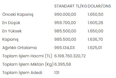 Altın piyasasında, en düşük 959 bin 700 lira, en yüksek 985 bin 500 lirayı gören standart altının kilogram fiyatı, günü önceki kapanışa göre yüzde 0,5 düşerek 985 bin 500 liradan tamamladı.
