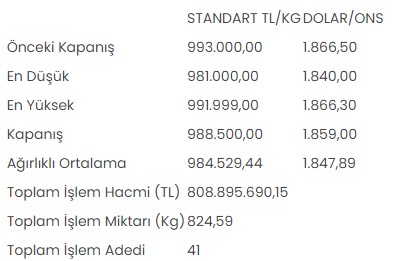 KMKTP'de, altında gerçekleşen toplam işlem hacmi 808 milyon 895 bin 690,15 lira, işlem miktarı ise 824,59 kilogram oldu.