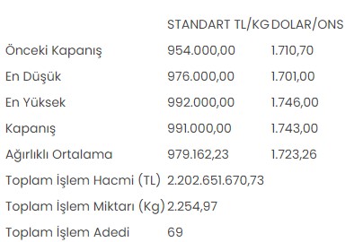 KMKTP'de, altında gerçekleşen toplam işlem hacmi 2 milyar 202 milyon 651 bin 670,73 lira, işlem miktarı ise 2.254,97 kilogram oldu.
