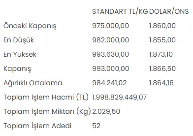 KMKTP'de, altında gerçekleşen toplam işlem hacmi 1 milyar 998 milyon 829 bin 449,07 lira, işlem miktarı ise 2.029,50 kilogram oldu.