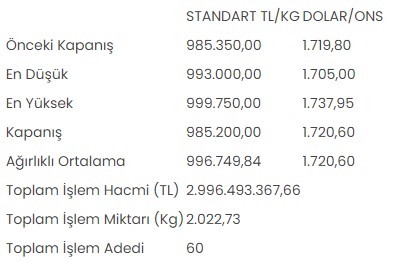 Tüm metallerdeki toplam işlem hacmi de 2 milyar 7 milyon 154 bin 835,49 lira düzeyinde gerçekleşti.