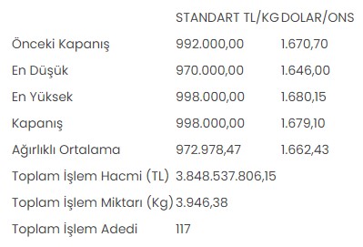 KMKTP'de, altında gerçekleşen toplam işlem hacmi 3 milyar 848 milyon 537 bin 806,15 lira, işlem miktarı ise 3.946,38 kilogram oldu.