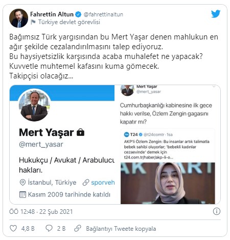 Altun: "Bağımsız Türk yargısından bu Mert Yaşar denen mahlukun en ağır şekilde cezalandırılmasını talep ediyoruz. Bu haysiyetsizlik karşısında acaba muhalefet ne yapacak? Kuvvetle muhtemel kafasını kuma gömecek. Takipçisi olacağız..." paylaşımında bulundu.