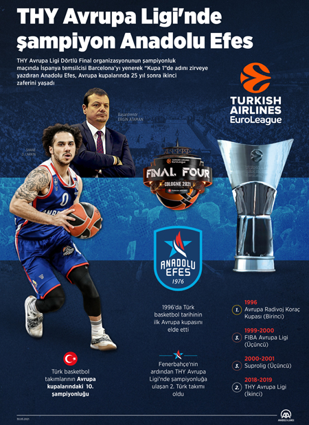 Anadolu Efes daha önce finali kaçırdığı Final Four’da bu kez Türkiye’ye şampiyonlukla dönüyor. Ergin Ataman ve öğrencileri Barcelona’yı finalde 86-81’lik skorla mağlup ederek Euroleague 2020-2021 sezonu şampiyon oldu.