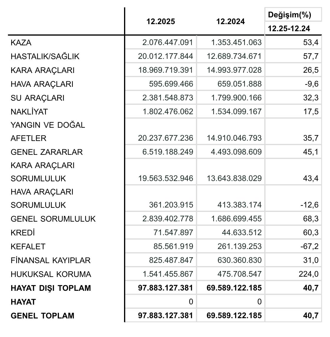 Branşlara göre Anadolu Sigorta’nın 2025 yılı prim üretimleri şu şekilde: