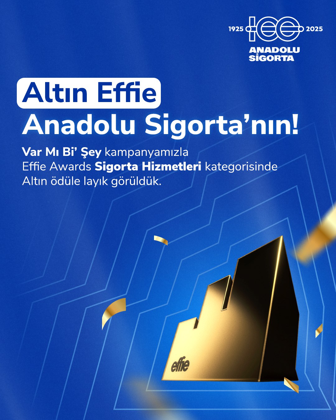 Türkiye'nin ilk ulusal sigorta şirketi olan ve bu yıl 100. yaşını kutlayan Anadolu Sigorta’nın, kasko ürünlerine yeni bir soluk getiren ve sektörde iletişim diliyle fark yaratan “Var Mı Bi’ Şey?” isimli reklam kampanyası, pazarlama ve reklam dünyasının en prestijli ödüllerinden biri olan Effie Türkiye 2025’te Altın Effie ödülünü kazandı. “Sigorta Hizmetleri” kategorisinde verilen ödülü, Anadolu Sigorta adına Pazarlama ve Müşteri Yönetimi Müdürü Elif Banu Kocaoğlu aldı.
