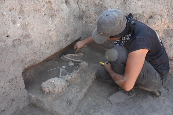 "Alanın geri kalan kısmında ise daha çok, bizim küp mezar dediğimiz çömlek mezarlar ortaya çıkarıldı. Mezarlığın bu kesimi daha çok, kadınların ve çocukların olduğu, biraz daha mezarlık alanının etrafındaymışız gibi görünüyor. Mezarlığın tam olarak merkezini kazmadık. Çocuk gömülerinde ve diğer gömülerde ölü hediyelerine de rastladık. Bunlarla ilgili çalışmalarımız devam ediyor. Hacettepe Üniversitesi Antropoloji Bölümü Öğretim Üyeleri bizlerle birlikte çalışıyor. Yine ortaya çıkardığımız iskeletlerden biri, çömlek mezar içerisinde. Aslında bir taş sandukanın içine oturtulmuş. Üzerini açtıktan sonra içerisinde 13-14 yaşlarında bir çocuğa ait kemiklere rastladık. Yine alanın kuzey kısmında, hemen aşağısında 2-4 yaşlarında bir bebeğe rastladık. Yine yanında hediyesiyle ve kaplarıyla birlikte. Özellikle gömülüş pozisyonlarında, bizim anne karnındaki fetüs pozisyonu görüyoruz.”